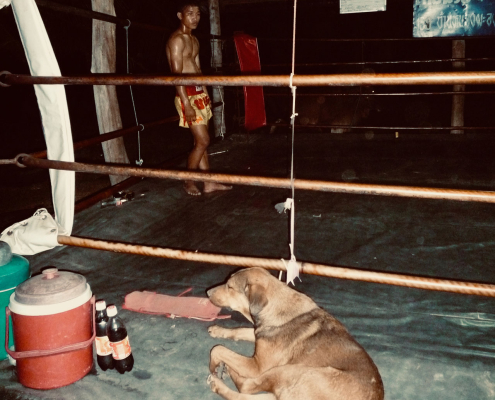 Altra categoria destinata a vedere infrangere le proprie illusioni è quella dei cosiddetti fighters. Dal fisico scolpito, i muscoli che animano tatuaggi di tigri e dragoni, sono qui per allenarsi nella Muay Thai, inseguono il sogno di trasformarsi in guerrieri, diventare campioni nei circuiti di Mixed Martial Arts. Per molti di loro il sogno si infrange subito, sgomentati dalla sorpresa quando vengono messi al tappeto da un thai molto più basso, magari con un po’ di pancetta, che ride allegramente al rumore della loro caduta. A sconfiggerli non è stato quel piccolo thai, è stata la loro arroganza, l’incapacità di sopportare il dolore, la sofferenza. Lo spirito stesso con cui affrontano un combattimento: anche quando si allenano non lo vivono con divertimento, sanuk, sono sopraffatti dallo spirito di competizione. Forse è per questo che fanno tanto rumore quando sono atterrati, perché sono grossi e perché con loro cade un grosso pezzo dell’Occidente.