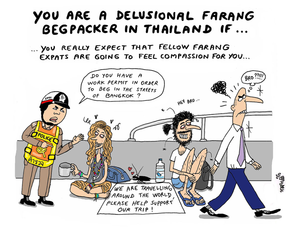 Quei giovani, squallidi occidentali, in genere in acconciatura rasta e larghi pantaloni a disegni d’elefanti oggi tanto in voga, che chiedono l’elemosina di fronte alle stazioni della metropolitana di Bangkok ne sono un perfetto esempio. Li chiamano begpacker, contrazione di “begging” e “backpacking”, chiedere l’elemosina e viaggiare zaino in spalla. Credono o fanno finta di credere che la povertà sia davvero un ponte sull’abisso che separa la loro fantasia della povertà dalla povertà reale di chi magari vive in uno slum della citta degli Dei. Né comprendono che la loro falsa povertà non è considerata dai passanti come una prova d’ascetismo, di rinuncia. Nella migliore delle ipotesi sono considerati dei reietti, perché un occidentale, per definizione, non può essere povero. Non secondo i canoni di un orientale. E difatti non lo è. Tanto più considerando che l’elemosina non è richiesta per mangiare bensì per acquistare un biglietto di ritorno a casa o per continuare il viaggio. In altri casi quell’atteggiamento è considerato offensivo nei confronti dei locali, di quelli davvero poveri. Se poi quell’occidentale è davvero povero, beh, allora questa è la manifestazione di un karma orribile.