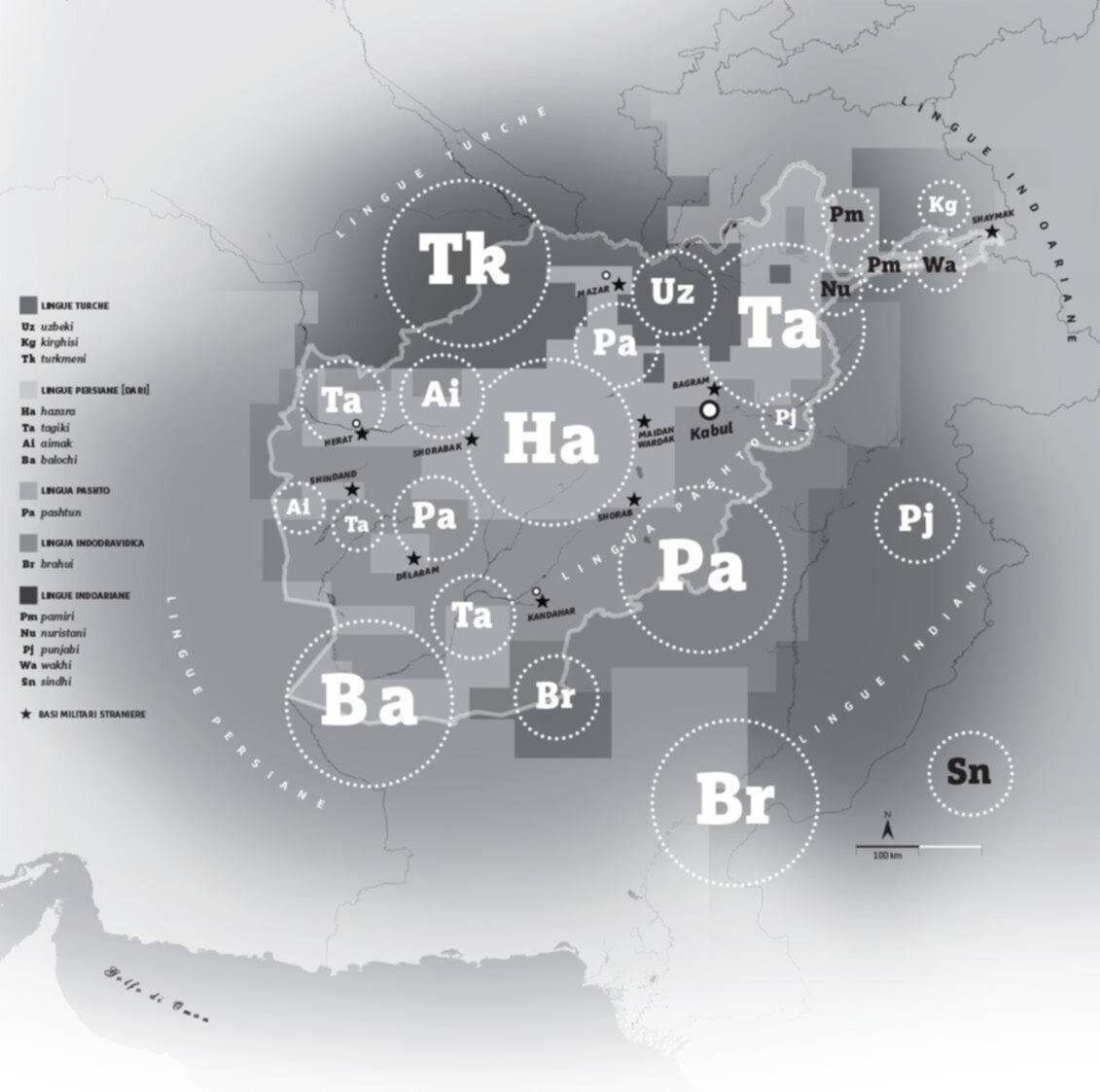 Una mappa dei gruppi etnolinguistici dell’area, tratta da “La Grande Illusione”, a cura di Emanuele Giordana, Torino, Rosenberg & Sellier, 2019