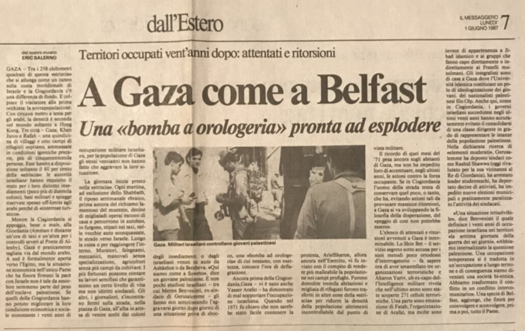 Trentaquattro anni fa la popolazione della Striscia era un quinto dell’attuale e l’estensore dell’articolo era già stupito della densità e della precarietà della condizione delle esistenze in quell’inferno, che già nel 1987 era chiaramente inquadrato come un sistema di apartheid («Qui siamo come a Soweto»), ma “la bomba a orologeria” è stata fatta brillare più volte senza fare danni, se non riducendo diritti, producendo vittime palestinesi e mettendo le radici di quella società bi-etnica che ora anima la guerra civile in corso nelle città israeliane abitate da arabi ed ebrei.
