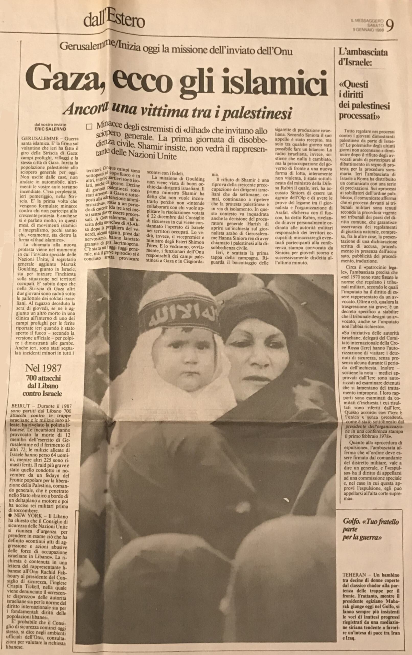 Tel Aviv vedeva nel leader del movimento, il paraplegico Sceik Yassin, un uomo di fede da contrapporre all’Olp. La sua “Mujama”, una organizzazione caritatevole con scuole, cliniche, una biblioteca e una università, poteva alleggerire la pressione sugli occupanti e ridurre la tensione che rischiava di esplodere. «Se fossi nato e cresciuto qui – mi disse allora Giulio Andreotti durante una visita nella Striscia – diventerei un terrorista». Tornai a Gaza appena scoppiata la prima Intifada e vi incontrai i leader di Hamas che erano usciti allo scoperto aggiungendo alla loro attività di assistenza sociale una Carta intrisa di antisemitismo e votata alla distruzione di Israele.