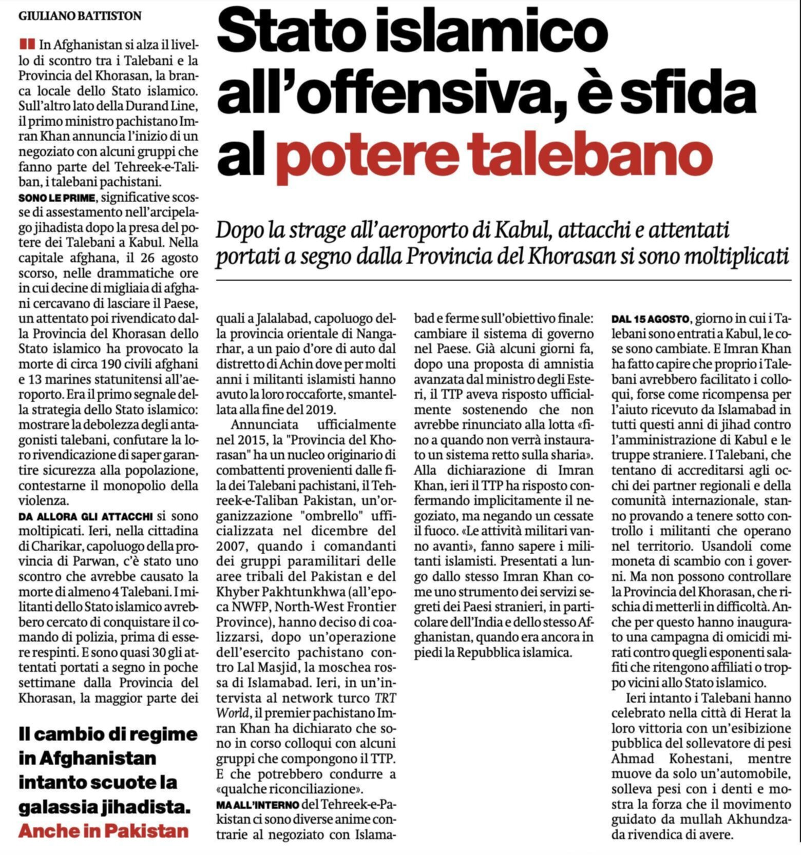 E poi: «Secondo Mohammed Ayoob, che ne scriveva il 2 agosto sull’australiano “The Strategist”, l’unico paese scontento dell’uscita Usa dall’Afghanistan sarebbe proprio l’India, mentre Pakistan e Cina si preparerebbero a colmare il vuoto e Russia e Iran, sebbene temano i talebani, sarebbero contenti della mossa Usa».