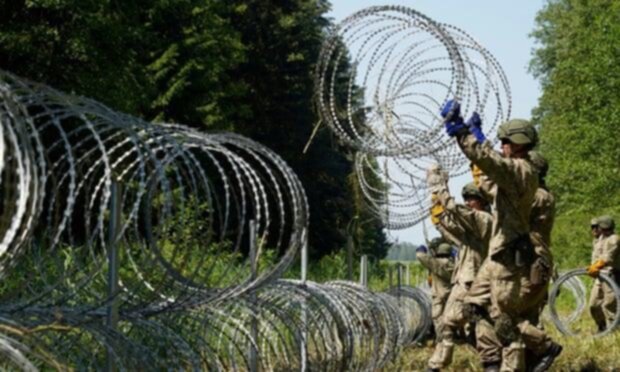 Soldati dell’esercito lituano depongono concertina al confine con la Bielorussia