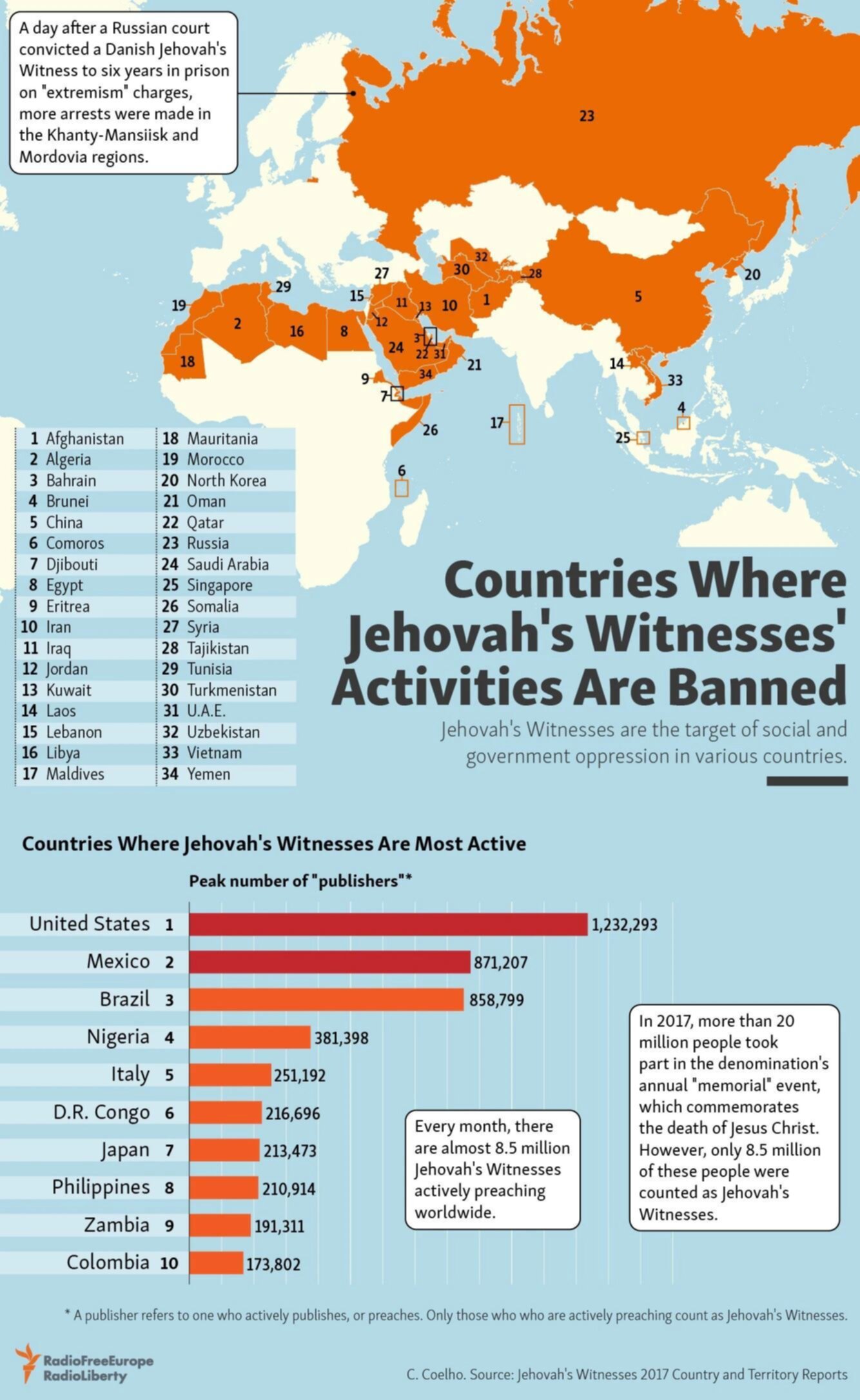 Dennis Christensen, cittadino danese e membro dei Testimoni di Geova, colpevole di “organizzare l’attività di un’organizzazione estremista” in Russia che è stato condannato a sei anni di carcere. Christensen, pur detenendo il passaporto danese, risiede in Russia dal 1999. È stato arrestato a Oryol nel maggio 2017, un mese dopo che il gruppo religioso era stato bandito.