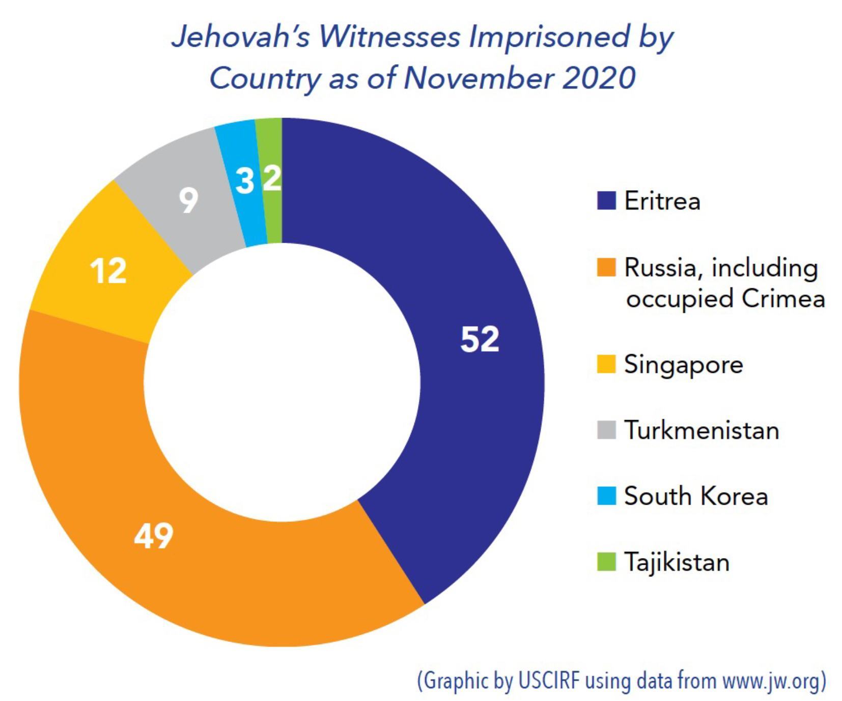 A novembre 2020, c’erano in Eritrea 52 Testimoni di Geova imprigionati per aver partecipato a riunioni o cerimonie religiose, alla predicazione e all’obiezione di coscienza al servizio militare. Alcuni di questi Testimoni sono stati imprigionati per più di 20 anni. Secondo i rapporti forniti dalla congregazione, quattro Testimoni di Geova sono morti in prigione e tre anziani sono morti poco dopo il loro rilascio, a causa delle cattive condizioni di detenzione e dei maltrattamenti da parte delle autorità carcerarie.