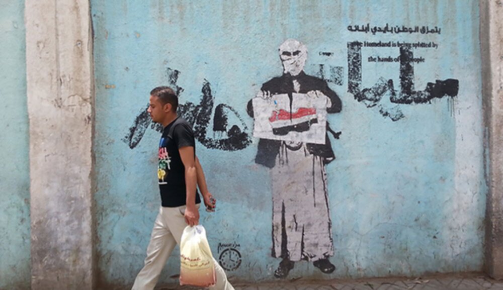Graffiti di Murad Subay sui muri di Sana’a: opere collettive piene di ironia nella loro denuncia degli attacchi jihadisti e degli scontri settari