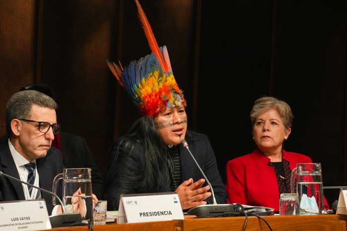 «Eliminare la partecipazione del pubblico significa tradire lo spirito dell’Accordo», ha affermato lapidario il leader indigeno Nadino Calapucha di fronte alla riunione plenaria, attorno al tavolo rotondo della sede della CEPAL. Con il volto dipinto e il copricapo di piume della sua comunità, il portavoce del Coordinamento di Organizzazioni Indigene della Regione Amazzonica (COICA) ha chiamato a rispettare uno dei pilastri di Escazú: la possibilità che, al tavolo direttivo, prenda la parola qualsiasi persona proveniente dai territori dei paesi aderenti.