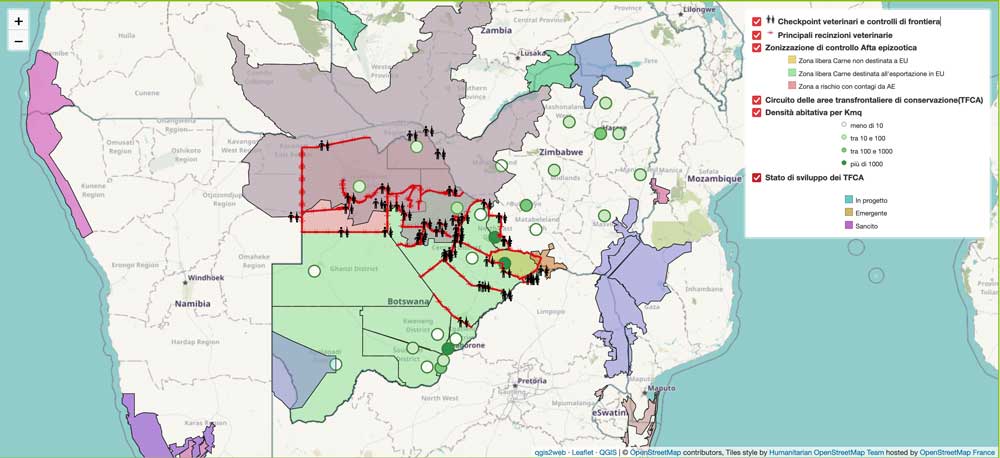 Due storie diverse, separate da una linea – una tra le tante che segnano le mappe del continente – che arbitrariamente attraversa territori comuni agli allevatori e, soprattutto, al bestiame. E sono proprio gli animali – il bestiame da reddito destinato alle esportazioni, così come la fauna che popola gli ambienti naturali – che sembrano essere al centro di questa vicenda: per raccontare la gestione delle zone di confine tra Botswana e Zimbabwe (ma anche, ampliando lo sguardo, Namibia, Zambia e Sudafrica) non si possono non tenere in conto le relazioni tra bestiame allevato e selvatico, e tra uomo e ambiente, insieme alle dinamiche migratorie prettamente umane. Parliamo infatti di una regione caratterizzata dalla presenza (e dall’ampliamento) di parchi naturali e zone protette transfrontaliere, tra cui quella dell’Okavango-Zambesi. Ampie zone, quindi, in cui la protezione delle specie animali selvatiche da un lato, e dei bovini allevati per l’esportazione dall’altro, rappresenta evidentemente una priorità politica.