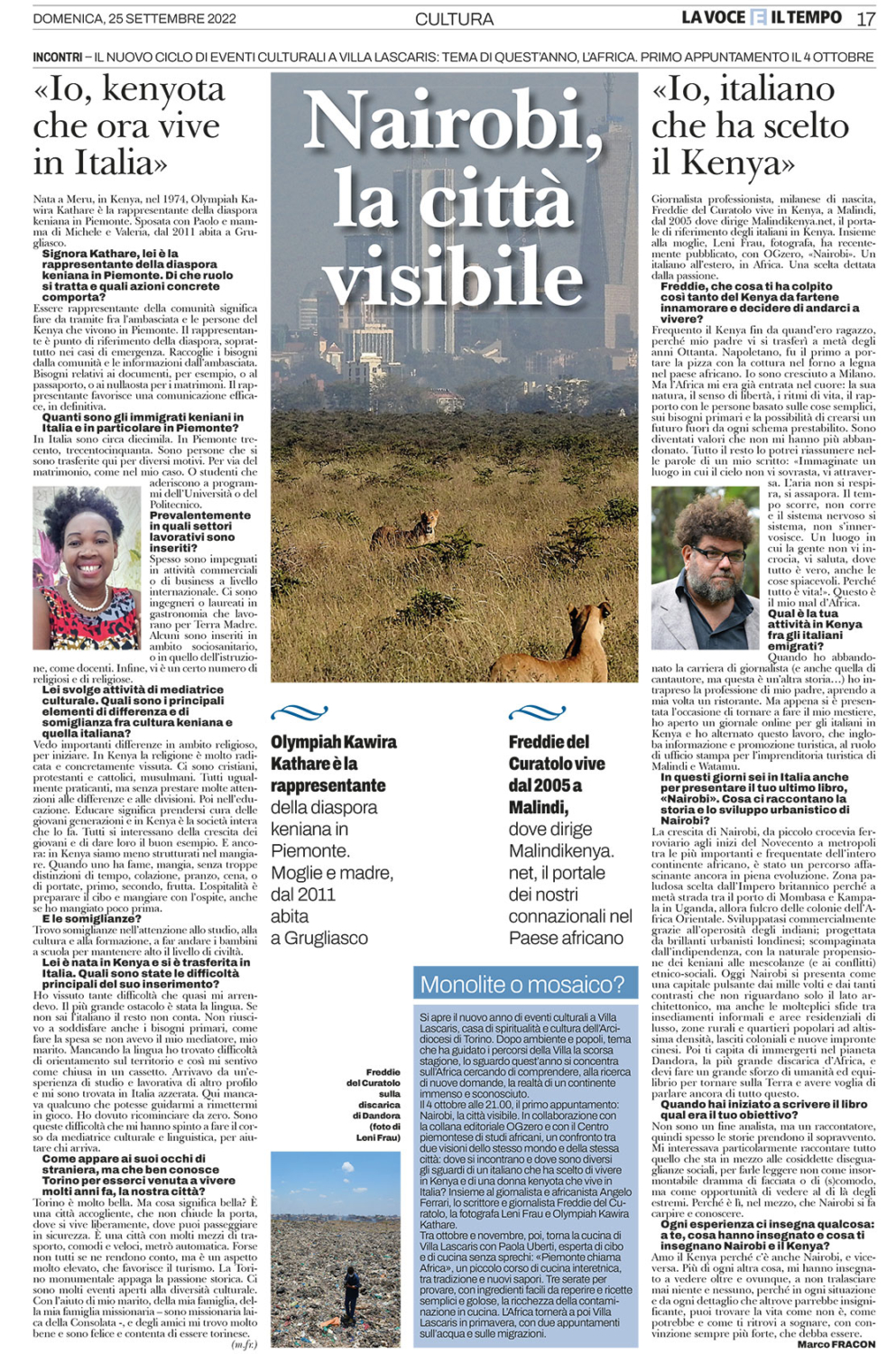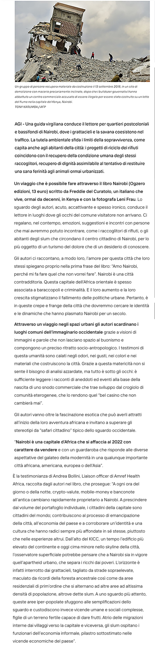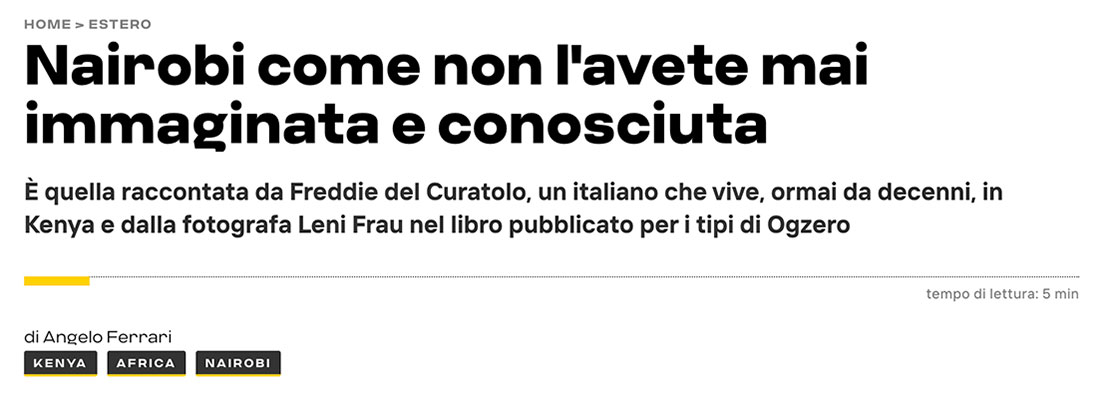 «Nairobi è una capitale d’Africa che si affaccia al 2022 con carattere da vendere e con un guardaroba che risponde alle diverse aspettative del galateo della modernità in una qualunque importante città africana, americana, europea o dell’Asia. A ogni ora del giorno o della notte, crypto-valute, mobile-money e banconote all’antica cambiano rapidamente proprietario a Nairobi.