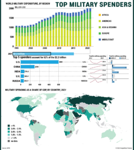 Interessante vedere grafici eloquenti di approvvigionamenti di armi, collocandoli nei vari scacchieri regionali, che corrispondono alle aree che vedono teatri di guerra; ma si vede soprattutto come si ripartiscono gli investimenti: Russia in testa (ma il dato per singoli stati vede gli Usa abbondantemente in testa), Emirati e Maghreb a ruota se il computo viene filtrato dal confronto in percentuale sul Pil. Dei più di 2000 miliardi che sarebbe il fatturato in armi nel 2021, 800 sono stati spesi dagli Usa (e questo si vede bene dalla Top Ten dei contratti firmati dal Dipartimento della difesa americano che abbiamo pubblicato nell’editoriale di agosto), seguiti da Cina, India, GB e solo quinta è la Russia, dimostrando così chi può essere più temibile; anche se il trend vede Cina e India in notevole accelerazione rispetto a un decennio fa – e questo è un dato che sposta in quel quadrante l’attenzione massima per paventare futuri conflitti. Infatti il primo grafico dimostra una corsa agli armamenti che vede l’Asia allargare la forbice della propria fetta di traffici d’armi rispetto al resto del mondo che incrementa progressivamente e nello stesso modo la propria spesa per preparare la guerra.