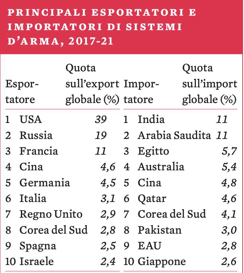 «I primi 25 stati in classifica hanno fornito il 99% delle esportazioni totali con i primi cinque stati in classifica— Stati Uniti (USA), Russia, Francia, Cina e Germania—responsabili del 77% delle esportazioni. A partire dal 1950, USA e Russia (o Unione Sovietica prima del 1992) sono sempre stati di gran lunga i principali fornitori di sistemi d’arma. Nel periodo 2017–21, le esportazioni statunitensi sono state maggiori di quelle russe del 108% mentre nel periodo 2012–16 erano superiori del 34%, un divario destinato ad aumentare. Sempre nel 2017–21 le esportazioni statunitensi hanno coperto il 39% del totale mondiale ed erano superiori del 14% rispetto al 2012–16. Al contrario, le esportazioni della Russia sono diminuite del 26% e le sue quote sul totale mondiale sono crollate dal 24% nel 2012–16 al 19% nel 2017–21».