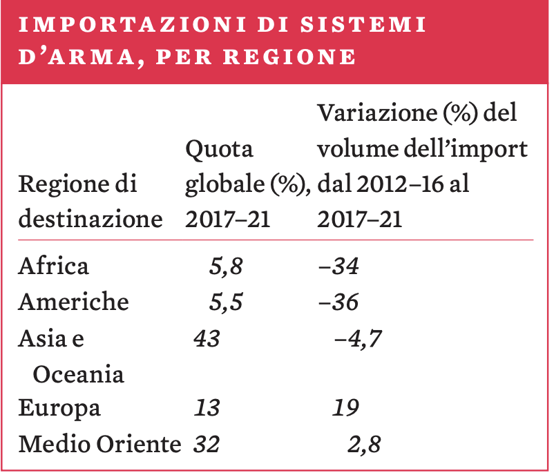 L’Istituto Internazionale di Ricerca sulla Pace di Stoccolma (SIPRI) ha registrato 163 stati come importatori di sistema d’arma nel quinquennio 2017–21. I cinque maggiori importatori di armi sono stati India, Arabia Saudita, Egitto, Australia e Cina, che insieme hanno rappresentato il 38% del totale delle importazioni. La regione che ha ricevuto il maggior volume di sistemi d’arma nel periodo 2017–21 è stata quella di Asia e Oceania (43% del totale mondiale), seguita da Medio Oriente (32%), Europa (13%), Africa (5,8%) e Americhe (5,5%). Tra il 2012–16 e il 2017–21, i flussi di armi verso l’Europa e verso il Medio Oriente sono aumentati (rispettivamente del 19% e del 2,8%), mentre sono diminuiti quelli verso l’Africa (–34%), le Americhe (-36%), l’Asia e l’Oceania (-4.7%). La maggior parte dei 163 stati importatori era direttamente coinvolta in conflitti armati violenti o in tensioni con altri stati in cui i sistemi d’arma importati hanno giocato un ruolo importante.