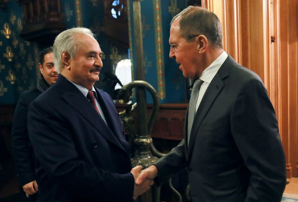 Il maresciallo libico Khalifa Haftar e il ministro degli Esteri russo Sergei Lavrov a Mosca, il 13 gennaio 2020 (Ufficio stampa del ministero degli Esteri russo via AP)
